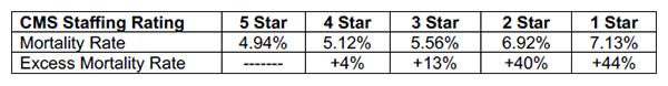 - Weighted mortality rates for residents of facilities receiving the top “5 Star” staffing rating were less than half the mortality rates of the rest of the facilities;