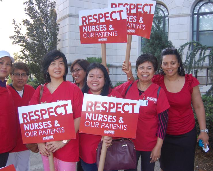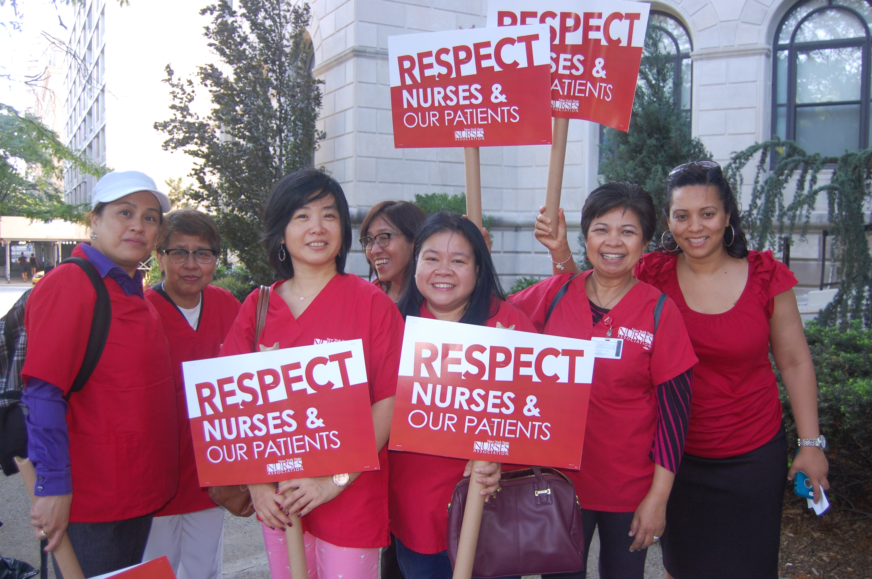 More than 300 nurses and caregivers turned out at Terence Cardinal Cooke. “We’re out today to stand up for our patients. We need to protect NYC’s caregivers,” said Fe Condeno Lontoc, RN and a member of the NYSNA bargaining committee at TCC.