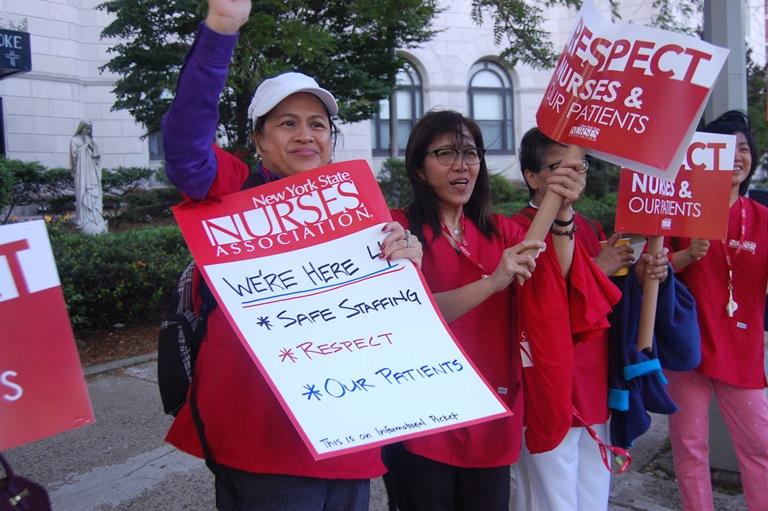 Chanting “We Care for New York,” hundreds of NYSNA nurses and 1199SEIU caregivers picketed for respect at Brooklyn’s Kingsbrook Jewish Medical Center and East Harlem’s Terence Cardinal Cooke long-term care facility on Wednesday.