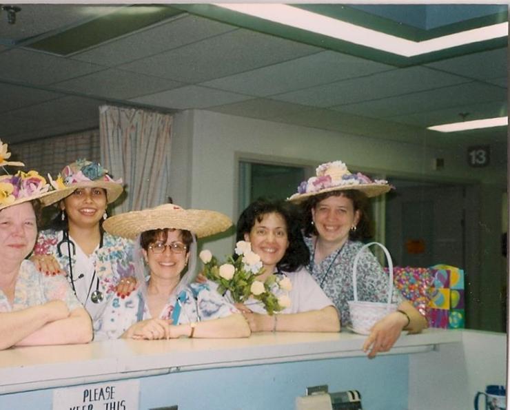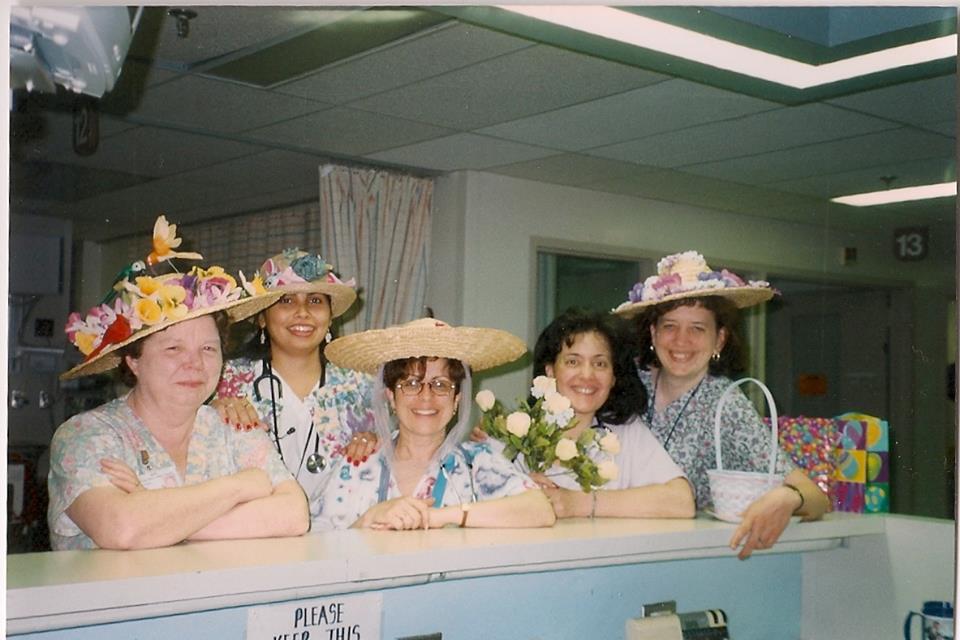 Anne M. Evans, RN and LICH ICU nurses Miriam Jewa, Joan Rowley, Julie Semente, and Nancy Andersen, with the Easter bonnets she made for them.