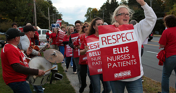 Our bargaining units represent more than 800 nurses between the three Capital Region facilities and our contract negotiations have been dragging on for months, and even years, in the case of Nathan Littauer Hospital, where RNs there marched in a lively picket line to a drum beat and patient care chants. Our issues are the same - we need better nurse staffing levels and the guidelines to protect them in our contracts.