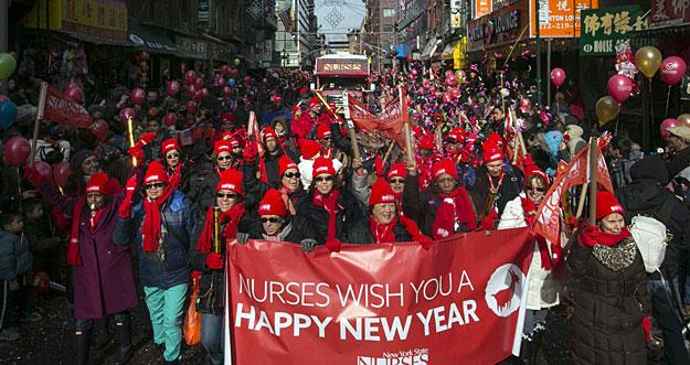 NYSNA members welcomed the Lunar New Year by marching in one of the city’s most festive and colorful parades. The parade, which winds down the streets of Manhattan’s Chinatown, draws hundreds of thousands of spectators. NYSNA nurses joined lion and dragon dancers, drummers and colorful floats in this spirited celebration of Asian culture and community. The crowd warmly welcomed NYSNA members, yelling, “We love nurses!” and, “Hooray Nurses!” as the NYSNA contingent marched by. This was NYSNA’s first time marching in the Lunar New Year Parade, but it won’t be our last! Be sure to join us next year as we welcome the Year of the Monkey!