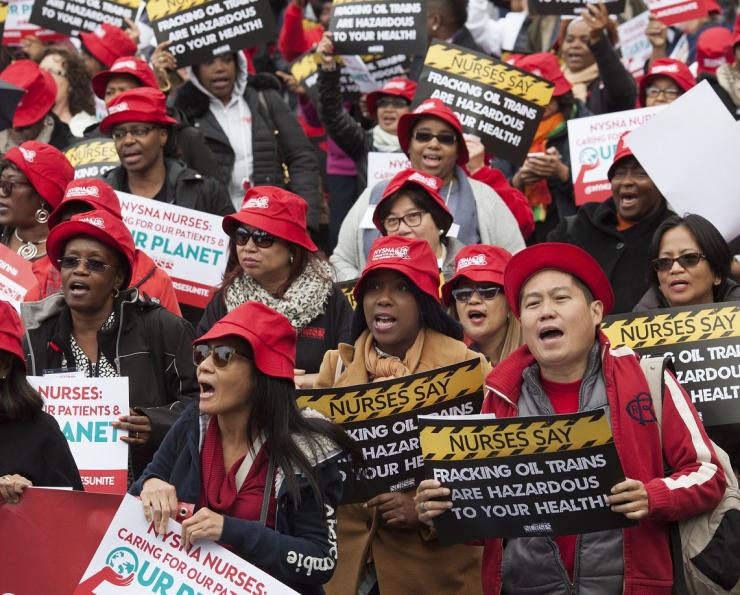 Fracked Bakken oil, which has the volatility of dynamite, is transported in train cars suitable for vegetable oil and orange juice, all over our state, including within one mile of 351 schools. Derailments have caused explosions all over the continent, from Mount Carbon, West Virginia, to Lac-Mégantic, Quebec, where 47 people were killed. NYSNA has put this issue front and center, staging a huge rally and dramatic “die-in” at our Convention, and protesting at the Port of Albany to calling for much tighter safety standards. Watch the video of our rally to learn more about what’s at stake. We are pleased to report that both Governor Cuomo and Attorney General Eric Schneidermann have taken action to enhance inspection frequency and safety standards around bomb trains.