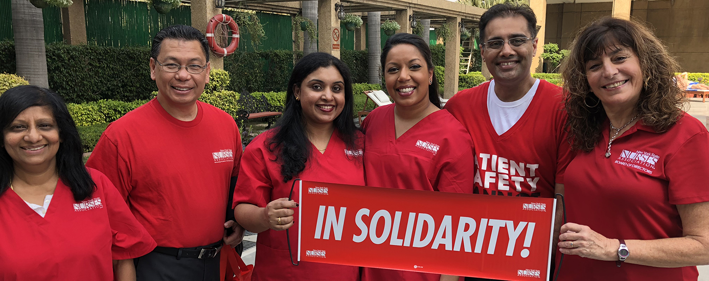 In late February, a delegation of five NYSNA nurses traveled to India for our first-ever International Solidarity Mission to that country. Members of the United Nurses Association (UNA), a union of 5 million nurses in India, greeted our delegation at the airport. NYSNA nurses lent our support to their strike for safe staffing and better pay and benefits at KVM Hospital, bringing much-needed media attention to the struggle. The strike has lasted for five months. NYSNA President Judy Sheridan-Gonzalez, RN, spoke words of encouragement and solidarity to the union members assembled at UNA’s first convention.