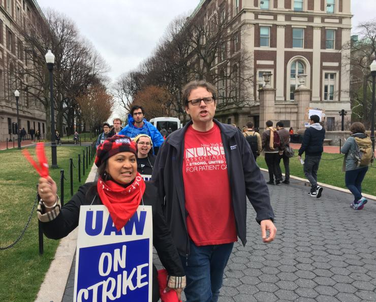 We stand in solidarity with the graduate students at Columbia University in the City of New York, who are striking for union recognition. NYSNA Board Members Sean Petty, RN, and Nella Pineda-Marcon, RN, walked the picket line with graduate workers, sending the message that we will be there until they win!