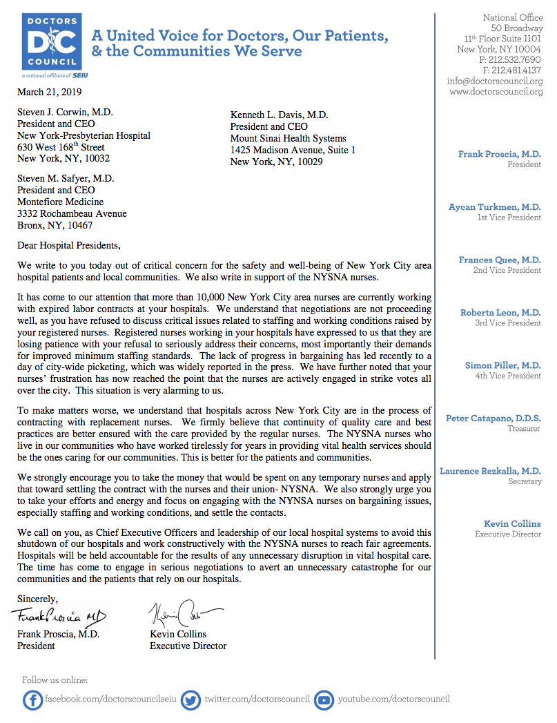 NYSNA is proud to share a letter of support from the Doctors Council, signed by President Frank Proscia, M.D., and Executive Director Kevin Collins, expressing their strong backing of the 10,000 NYSNA nurses currently working with expired labor contracts at three hospital systems in NYC.