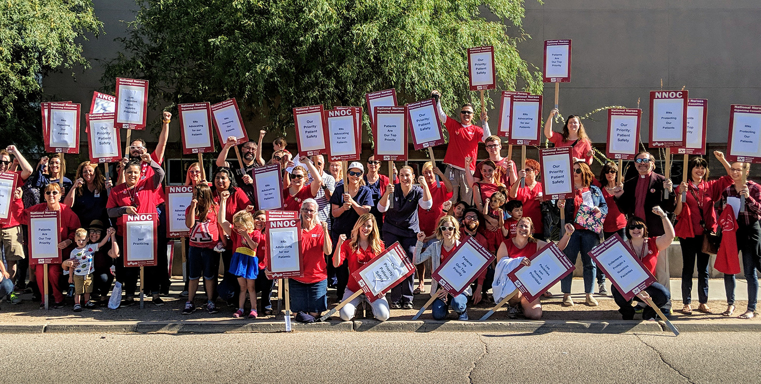 NYSNA offers our strongest support and expressions of solidarity for our National Nurses United sisters and brothers on strike today at University of Chicago Medical Center and at Tenet-affiliated, St. Joseph’s and St. Mary’s Hospitals in Tucson, Arizona. The one-day walkout in Arizona, which aims to get management to invest in nursing staff and patient care, is the first-ever registered nurse strike in the state. In Chicago, more than 2,200 nurses walked out as part of an effort to win enforceable staffing ratios that prioritize patient care and fair wages. Nurses will always unite to stand up for safe patient care and strong RN standards!