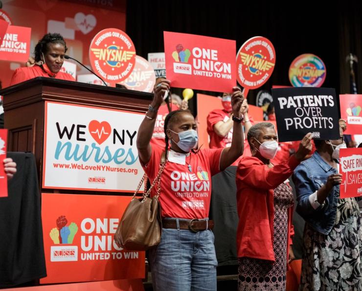 NYSNA nurses were joined by NYC Central Labor Council President Vincent Alvarez, Manhattan Borough President Mark Levine, State Sen. Brad Hoylman, Assemblymember Eddie Gibbs, NYC Council Deputy Speaker Diana Ayala, NYC Councilmember Julie Menin, and NYC Councilmember Erik Bottcher, who spoke out in solidarity with the members.