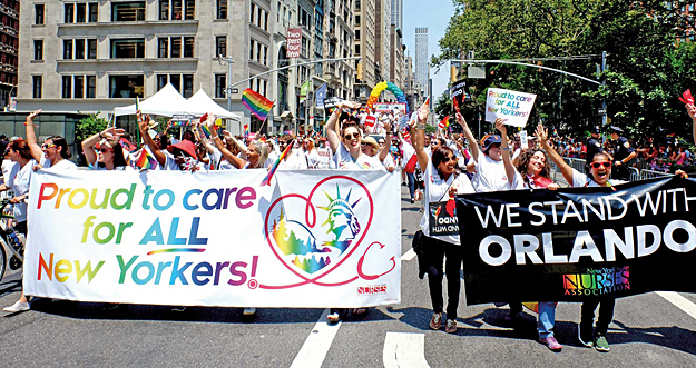 NYSNA’s float and a contingent of 50 members participated in New York City’s Gay Pride Parade on June 26. This was the first time that the union officially took part in the parade. NYSNA members were among the 30,000 who marched down Fifth Avenue into Greenwich Village. Earlier in the month, on June 13, members participated in a vigil at the Stonewall Inn to memorialize the victims of the Orlando shooting.