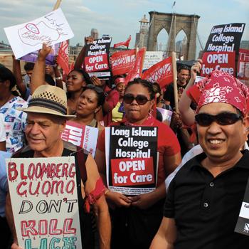 The open for care movement. Brooklyn is the epicenter of New York’s healthcare crisis – and the center of our growing movement to keep hospitals open for care. We demand a moratorium on all hospital closures and cuts until state officials can guarantee that every New Yorker will have access to quality care in our communities. Pictured here, protesting the planned closings of Interfaith Medical Center and Long Island College Hospital. On August 20, in a hopeful step toward keeping LICH open, a judge called the hospital’s refusal to accept patients “a travesty” of its mission and invalidated its sale.