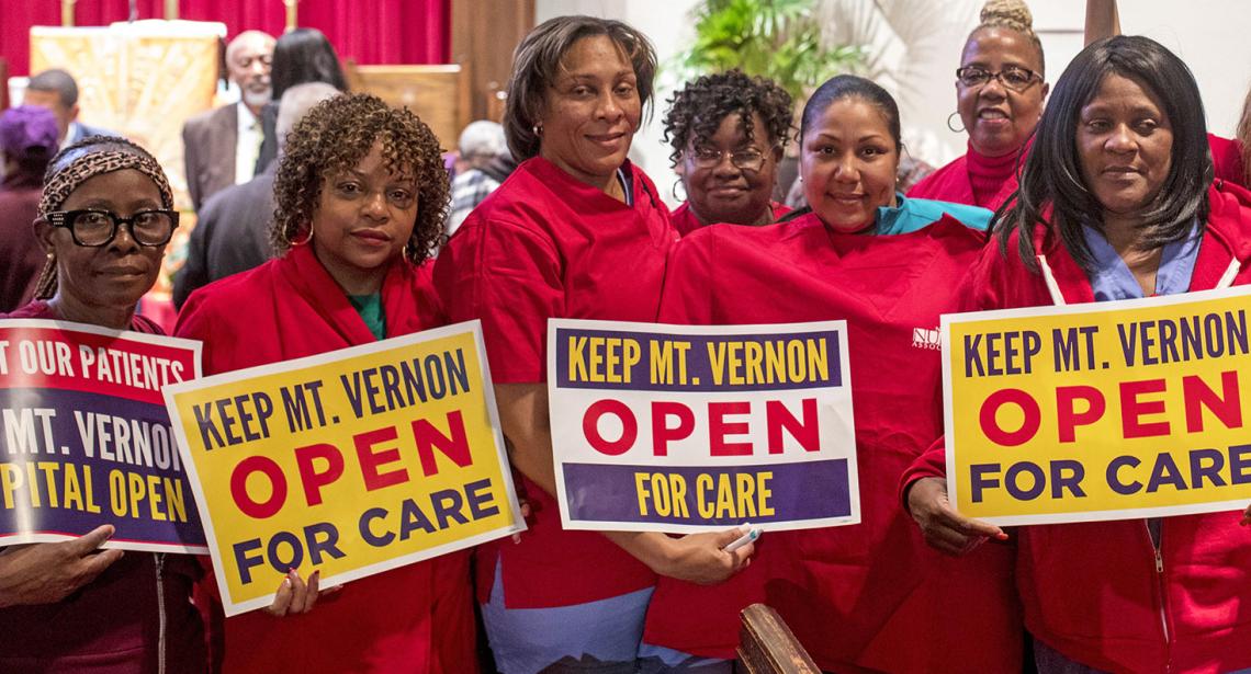 NYSNA nurses, elected officials, healthcare workers and community leaders from across Mount Vernon gathered on October 23 at a town hall meeting to protest Montefiore Health System’s announced closure of Mount Vernon Hospital.