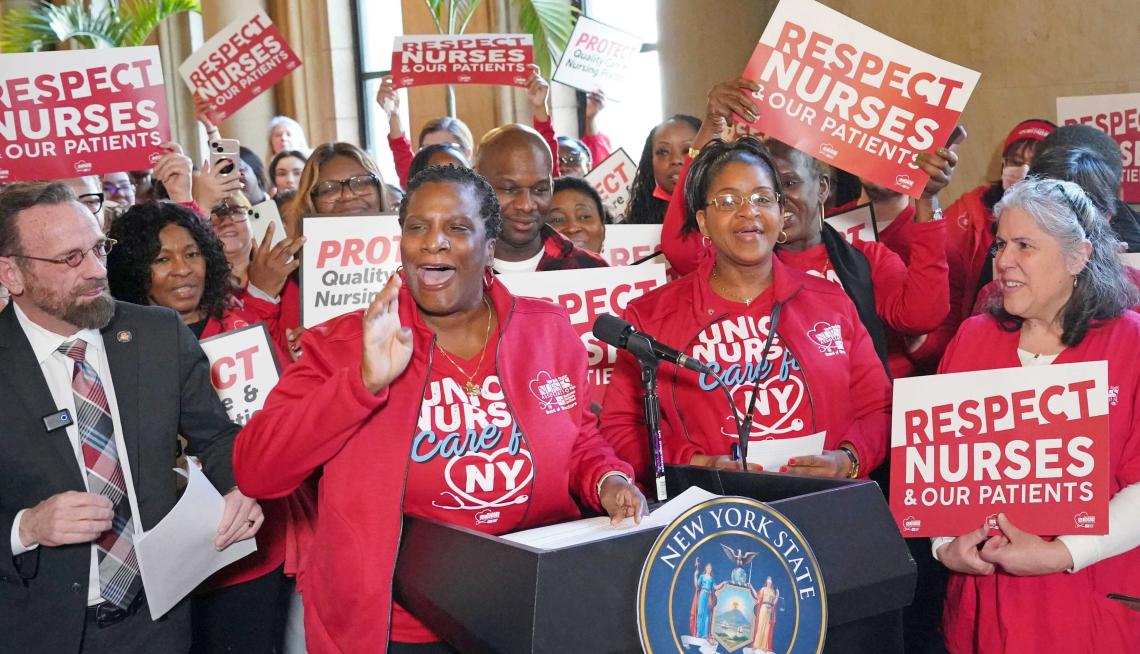 NYSNA President Nancy Hagans, RN, BSN, CCRN, speaks at a press conference demanding that lawmakers pass a budget that invests in safe, quality care for all New Yorkers.