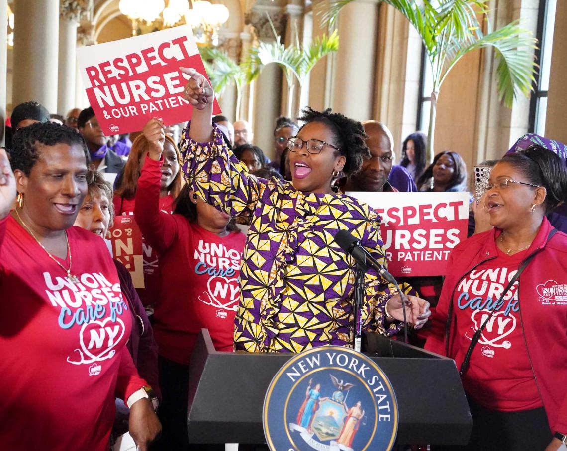 Assembly Member Phara Souffrant Forrest, RN, speaks at the press conference, calling on the Department of Health to enforce New York’s safe staffing law.