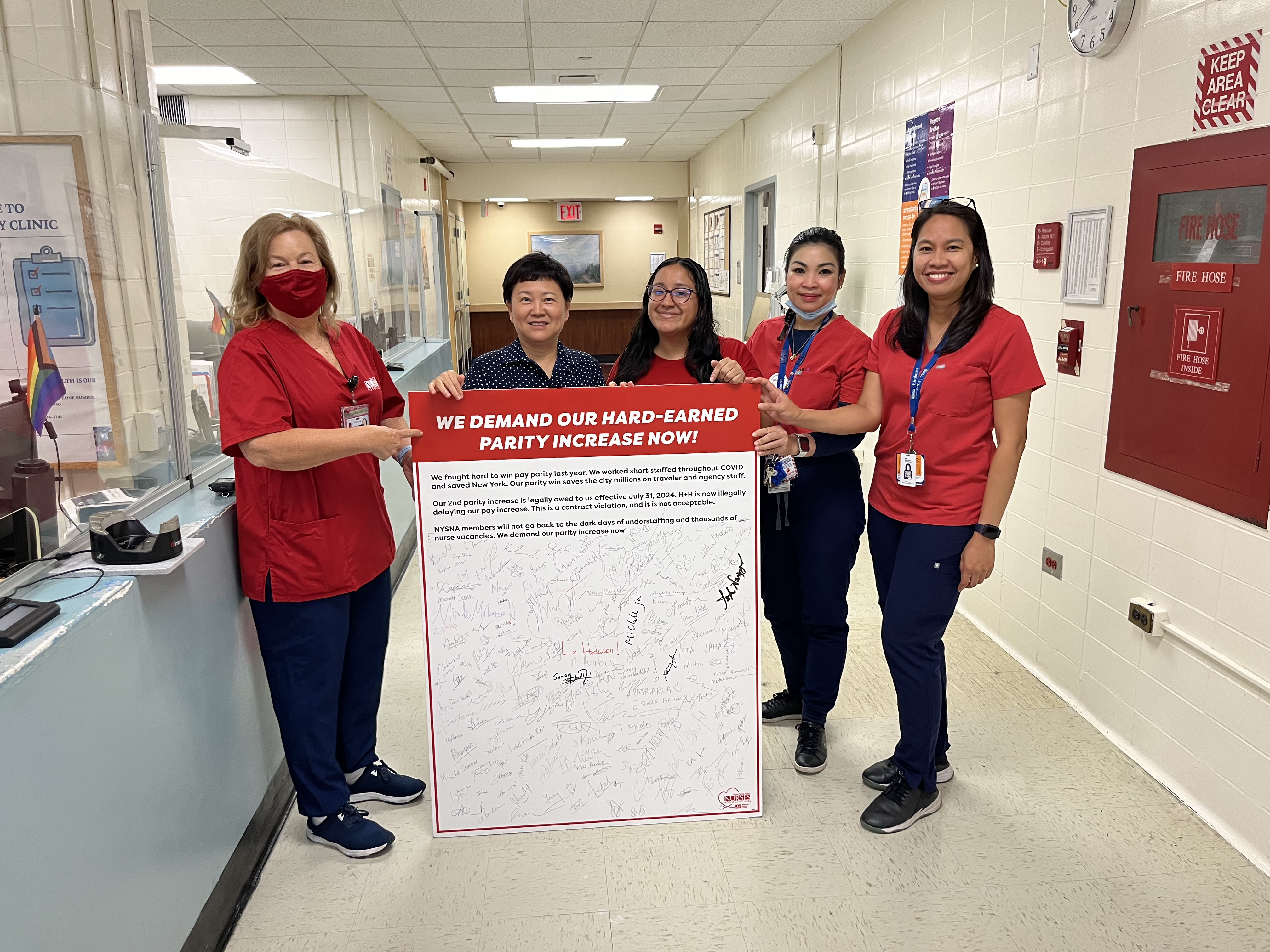 H+H nurses are wearing NYSNA red scrubs on Fridays to show their united demands for their hard-earned parity increases. They are joined by New York City elected officials who are showing their support and solidarity throughout the week on social media and demanding management deliver pay parity to nurses. Stay tuned for more actions and events in the upcoming weeks.