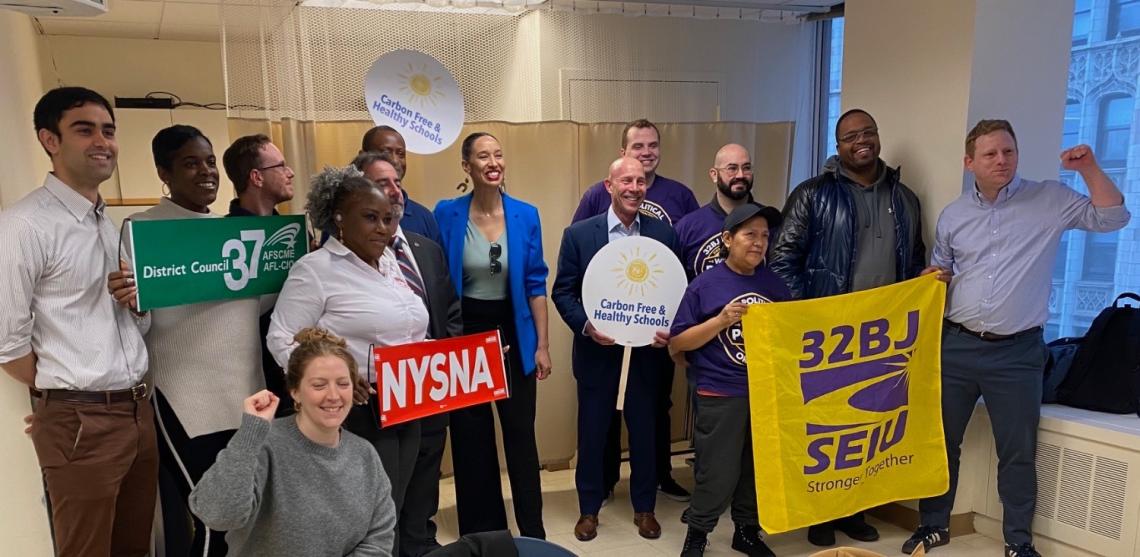 NYSNA board member Flandersia Jones, RN, lobbied on behalf of NYSNA on Thursday, April 11, in coalition with Climate Jobs NY. They lobbied City Council members at offices across City Hall. The focus was to get legislators to fully commit to Council Member Sandy Nurse’s NYC Public Solar Power Bill (Int. No. 353) that seeks to put solar power on public buildings. The bill would require the city to install 100 megawatts (MW) of solar on city buildings and schools by 2025 and 150 MW by 2030.  The bill already has a great amount of support, and it continues to grow because of the advocacy and voices of workers like NYSNA nurses who are championing climate justice legislation.