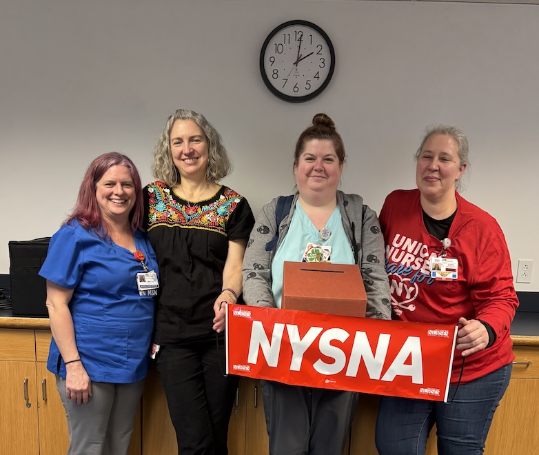 After months of bargaining for a fair contract that protects nurses and patients, NYSNA nurses at Westchester Medical Center (WMC)-HealthAlliance Hospital in Kingston ratified a strong contract on Monday. Nurses at WMC-HealthAlliance have been demanding protection from workplace violence, an issue that has only been growing over the last several years. Nurses spoke out on March 11 and secured a contract agreement that makes significant steps toward addressing nurse and patient safety and secures strong wage gains and protected benefits. Spectrum, Becker’s, Times Union, Crain’s and the Daily Freeman covered the nurses’ ratification.