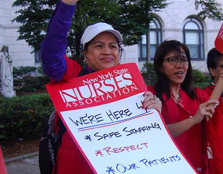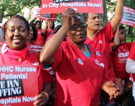 Chanting “We Care for New York,” hundreds of NYSNA nurses and 1199SEIU caregivers picketed for respect at Brooklyn’s Kingsbrook Jewish Medical Center and East Harlem’s Terence Cardinal Cooke long-term...