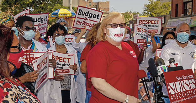 For months Albany has warned that healthcare, public transit, and school funding could face steep cuts if Washington doesn’t pass another COVID stimulus bill. But with Congress still deadlocked, a 20 percent across-the-board state budget cut is a clear and present danger. This year’s budget already included $2.5 billion in Medicaid cuts, and that’s why NYSNA, led by New York City Health + Hospital/Mayoral nurses, have been organizing to say no to these crippling cuts.