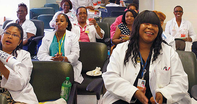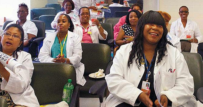 They are adding to that knowledge. At four workshops in the HHC system – Bellevue Hospital Center, Kings County Hospital Center, Jacobi Medical Center and, most recently, at Harlem Hospital Center – hundreds of RNs took part in seminars, fixing their attention on detailed presentations, and showing great interest in the compelling issues that surround climate change.