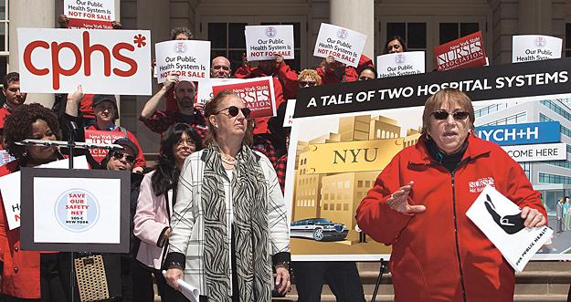“This city has a tale of two hospital systems: A public health system that provides access to all, and a private system that provides access to some,” said Anne Bové, RN, and President of NYSNA’s NYC H+H Executive Council. “H+H is the very foundation of healthcare in this city. You destroy it, and the whole system comes falling down.”