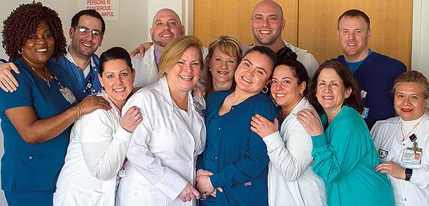 Some of SIUH‘s SPH Champions include, front (L to R): Donna Reid, PCA; Dianna Montalbano, RN; Kelly Moed, RN; Sandra O’Keefe, RN; Bridget Pena, PCA; Gabriella Cocchiola, PCA; Christine Williams, RN; Cheryl Kneifati-Hayek, RN. Back (L to R): Joseph Aranzullo, CT Tech; Peter Peghi, Imaging Manager; Christian Narducci, RN; and Dan Carragino, OTR/L