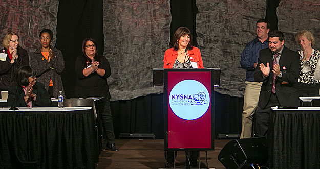 When Trish Kuhn, RN, a newly-elected NYSNA board member from Utica, NY, stepped to the podium of the Opening Plenary of Convention 2015 in Saratoga Springs, her voice resonated. “We have felt the unity this year!” she exclaimed. “We are the leading voice to take profit out of healthcare!”
