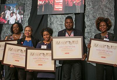 Five of the recipients of the Contract Action Hero Award: (from left) Bernita Stewart, RN; Venus Rulona, RN; Karines Reyes, RN; Andew Davis, RN; Dawn Minerve, RN