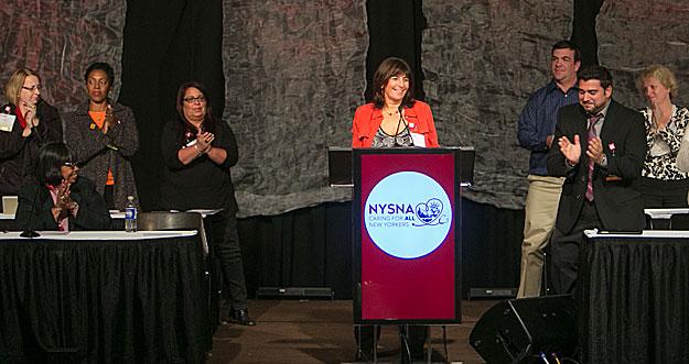 Aileen Gunther, the State Assembly Member from Sullivan and Orange Counties, is an RN and staunch supporter of nursing issues, including The Safe Staffing for Quality Care Act. She was one of many politicians who spoke at the Plenary Panel: “Advancing the Role of Nurses in the Health of Our Communities.” Others included NYS Comptroller Thomas DiNapoli, who handed over a reimbursement check for more than $41,000 to NYSNA (see below), and State Assembly Members Richard Gottfried, Angelo Santabarbara, Shelley Mayer and Al Graf. State Senators Adriano Espaillat and Marc Panepinto also were present to thank NYSNA members for hard work and commitment to patient care and community. Community and political campaign booths gave out literature and signed up many.